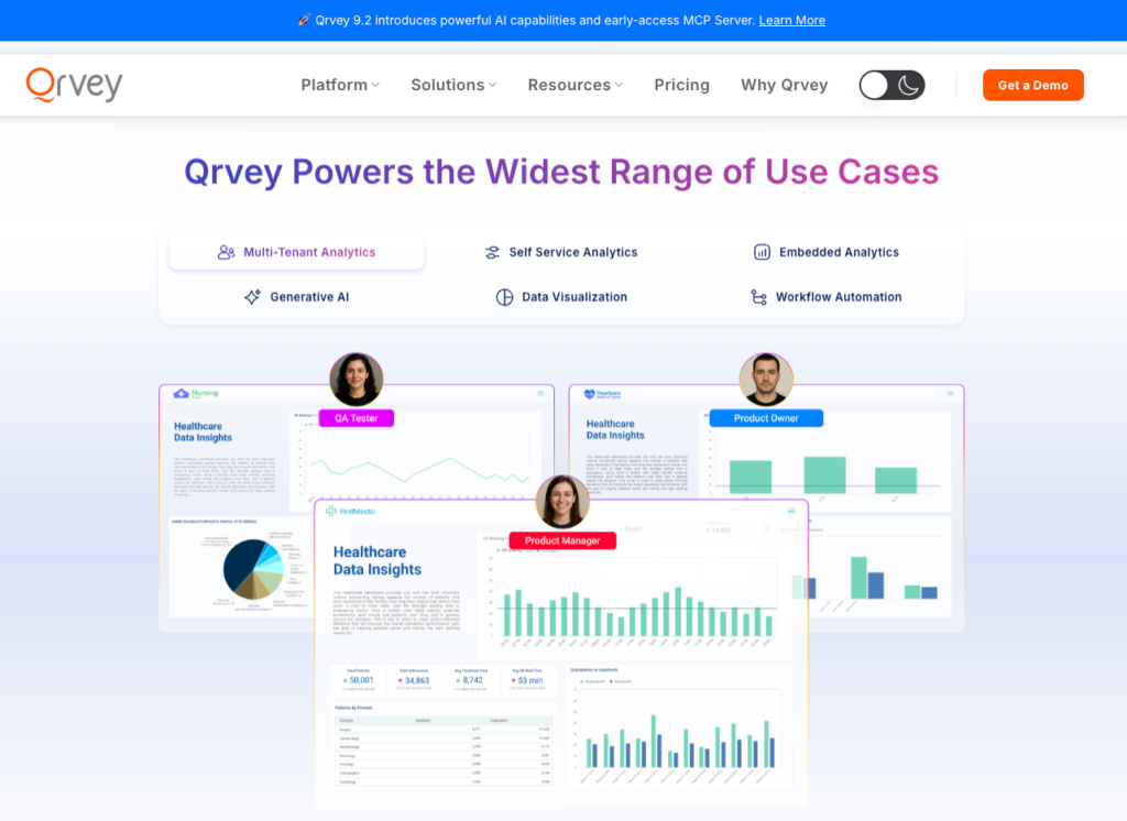 | Qrvey | SaaS companies needing complete multi-tenant analytics | Built-in data lake with JavaScript embedded analytics | Flat-rate pricing / Custom pricing |