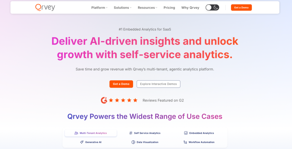 Qrvey is an embedded analytics platform built for multi-tenant SaaS. It delivers dashboards, self-service analytics, reporting, automation, agentic ai, and governance.